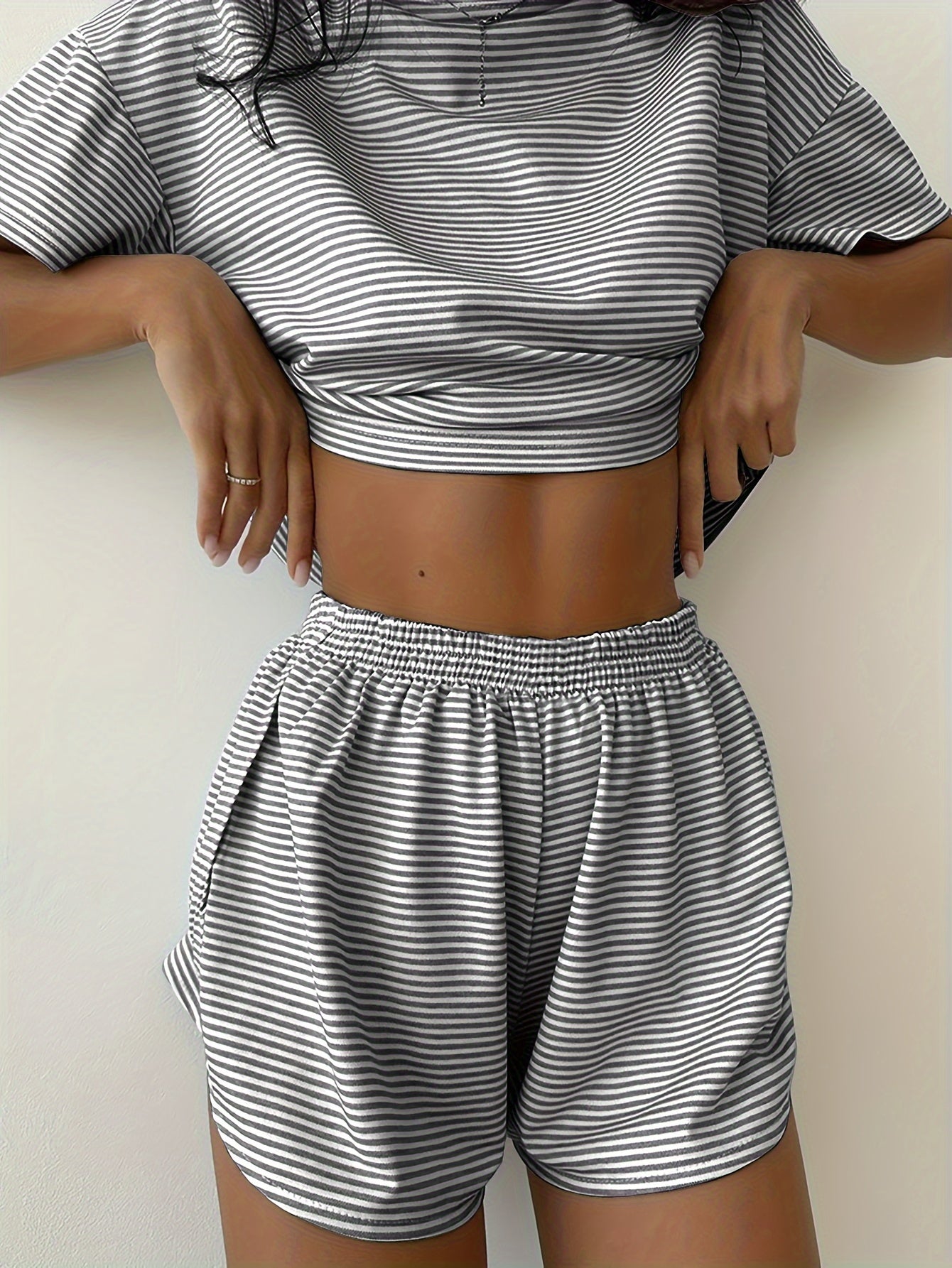 The set includes a short-sleeved crop-top with matching elastic-waist, split shorts. All made from the same high-quality, breatheable, buttery-soft fabric.